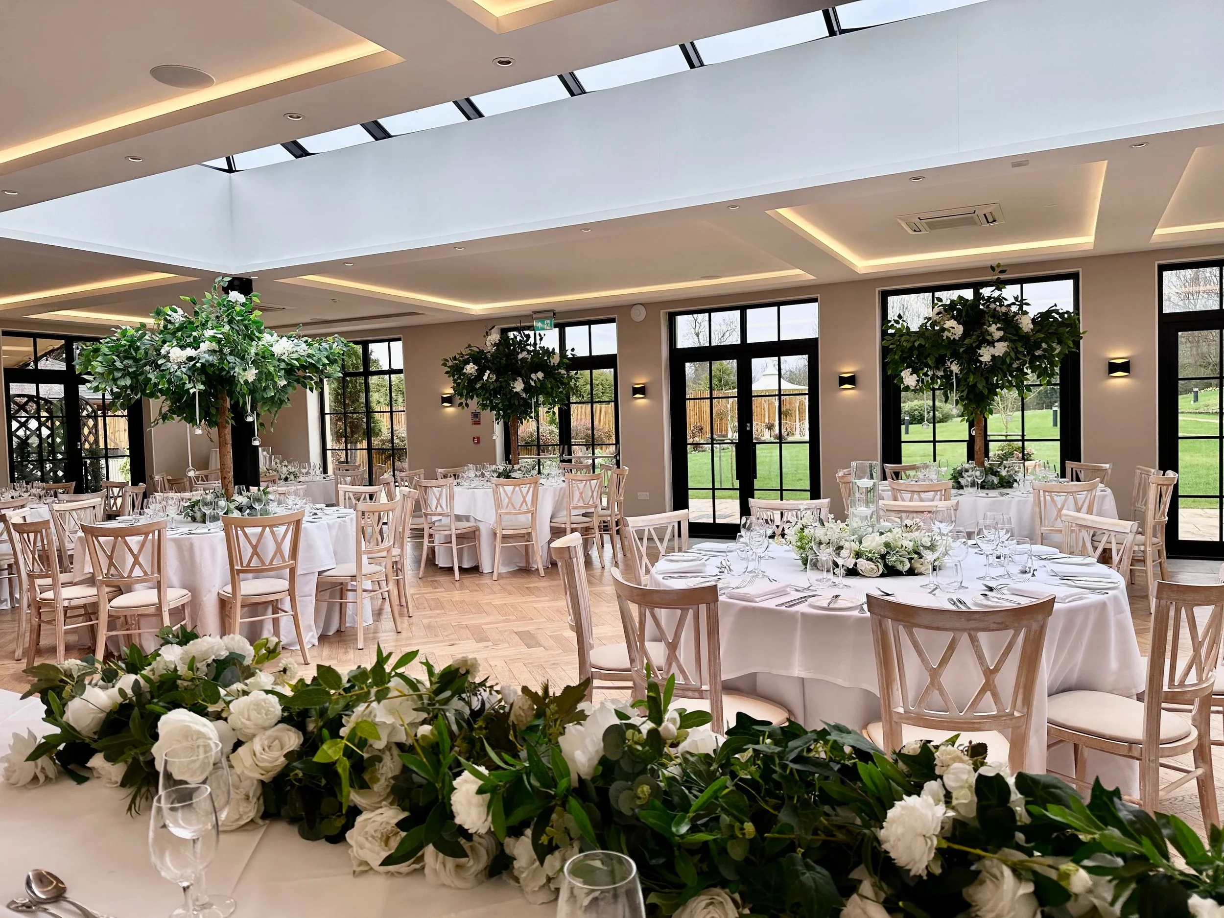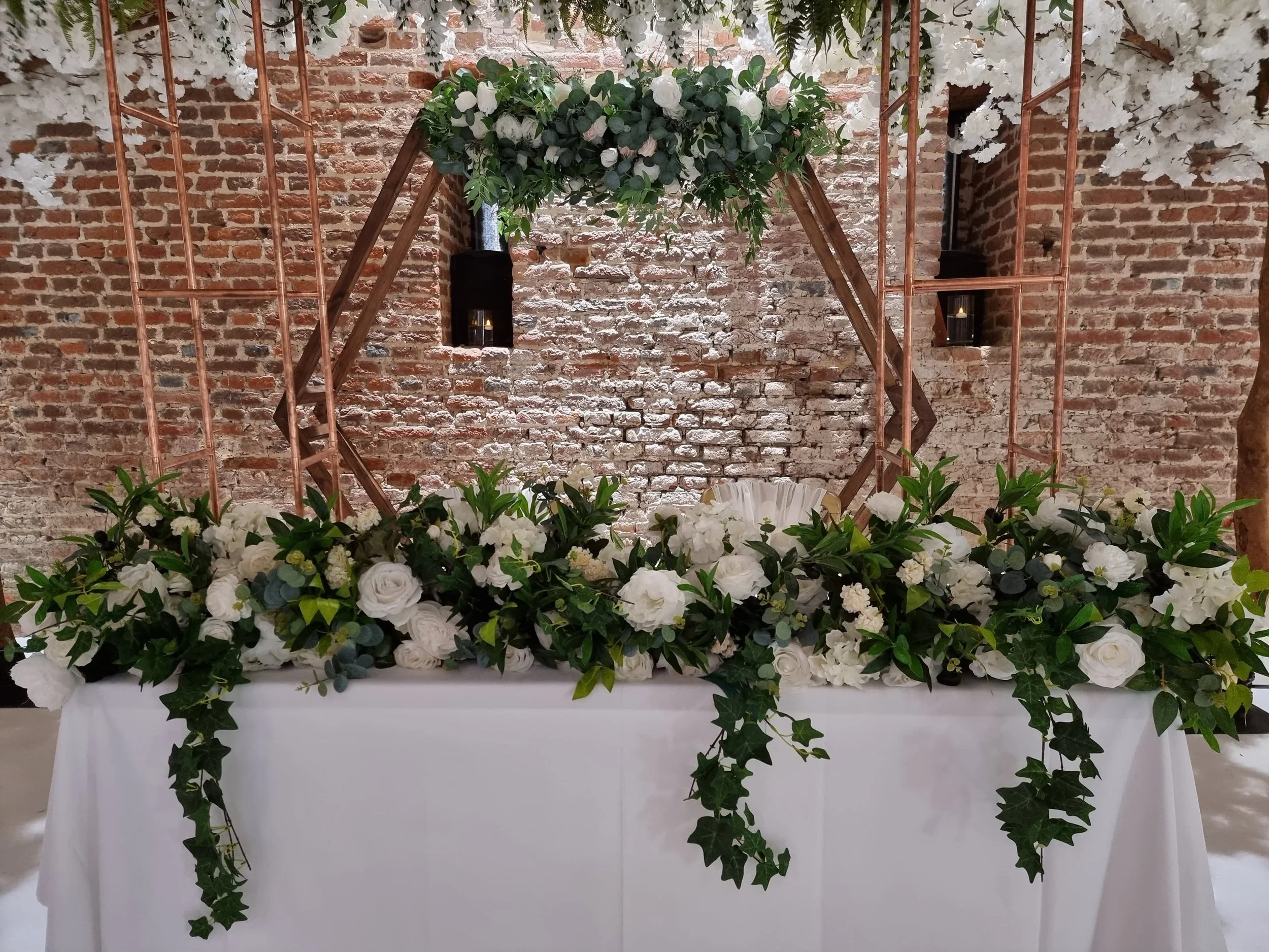 Perfect for registrars’ tables, top tables, or venue focal points, it adds organic charm and elegant detail. Designed to complement the Garden Collection, this piece pairs effortlessly with the matching centrepiece, arch, and flower wall for a cohesive look throughout your wedding or event.