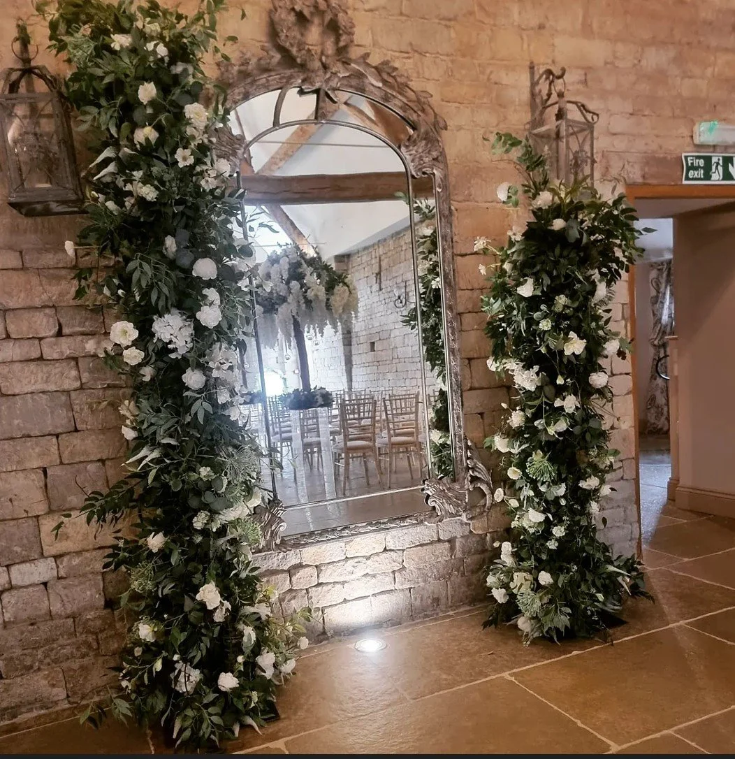 Our Greenery Floral Pillars bring effortless elegance and organic charm to your wedding or event. Designed in two complementary sizes — 2.4m and 1.8m high, these freestanding pillars are filled with wild-style greenery, soft white silk blooms, and delicate textures for a naturally romantic feel.