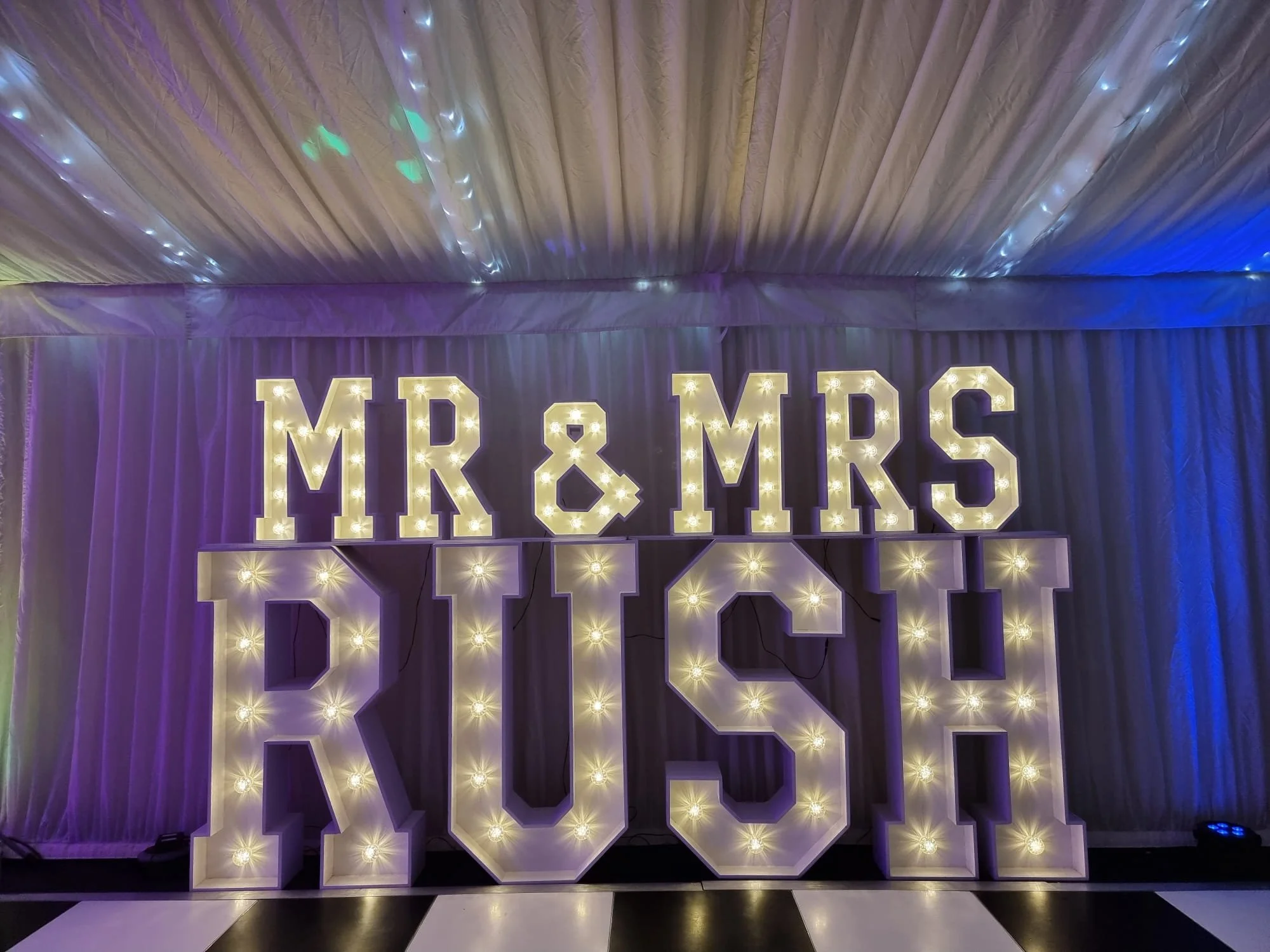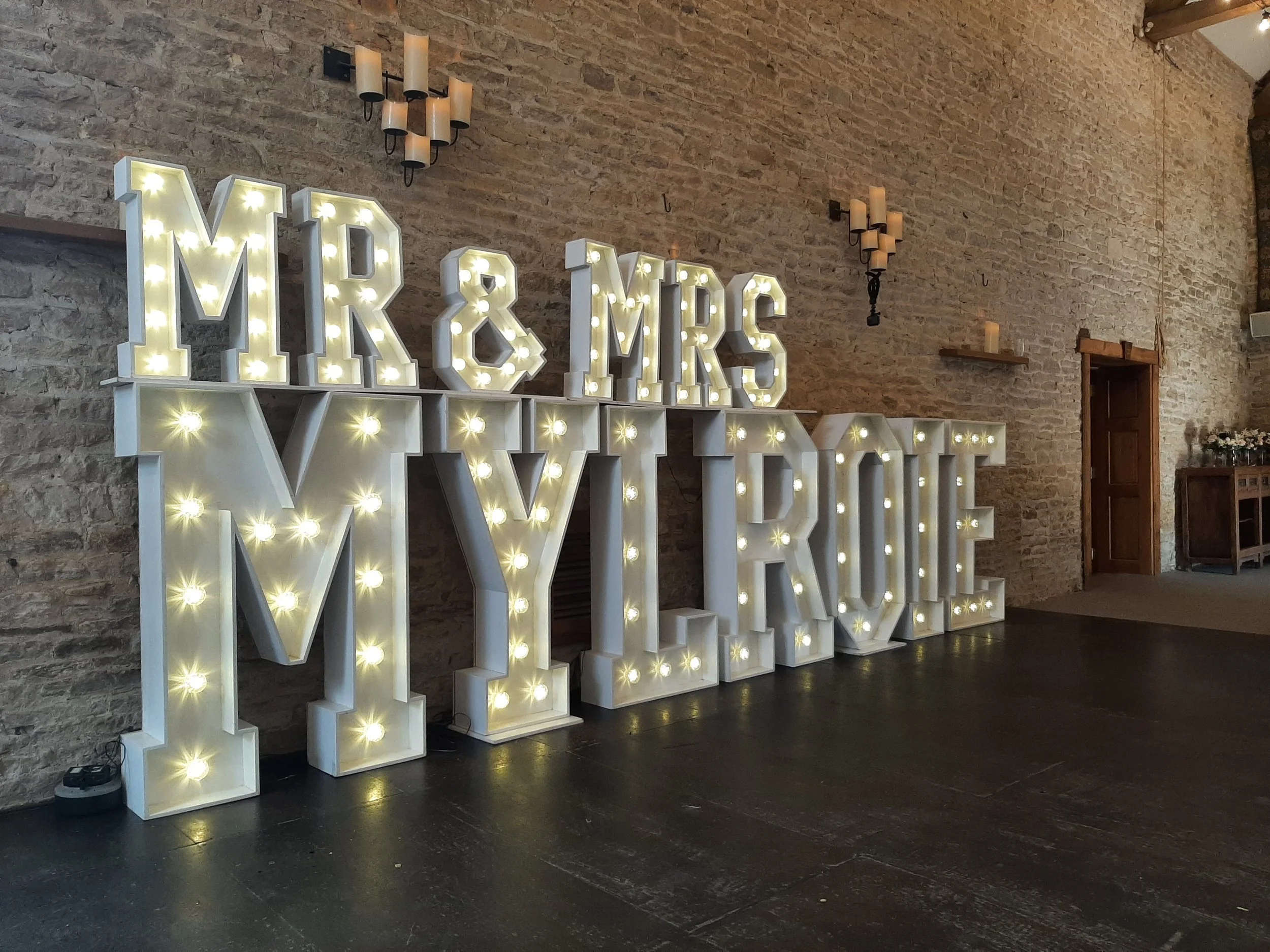 Our classic White 4ft Light up letters can be used to create your new shared surname. we have multiple of each letters so can spell any length of name required. These combined with our smaller MR&MRS - MRS&MRS-MR&MR- THE and TEAM create the perfect focal point to your wedding celebrations.