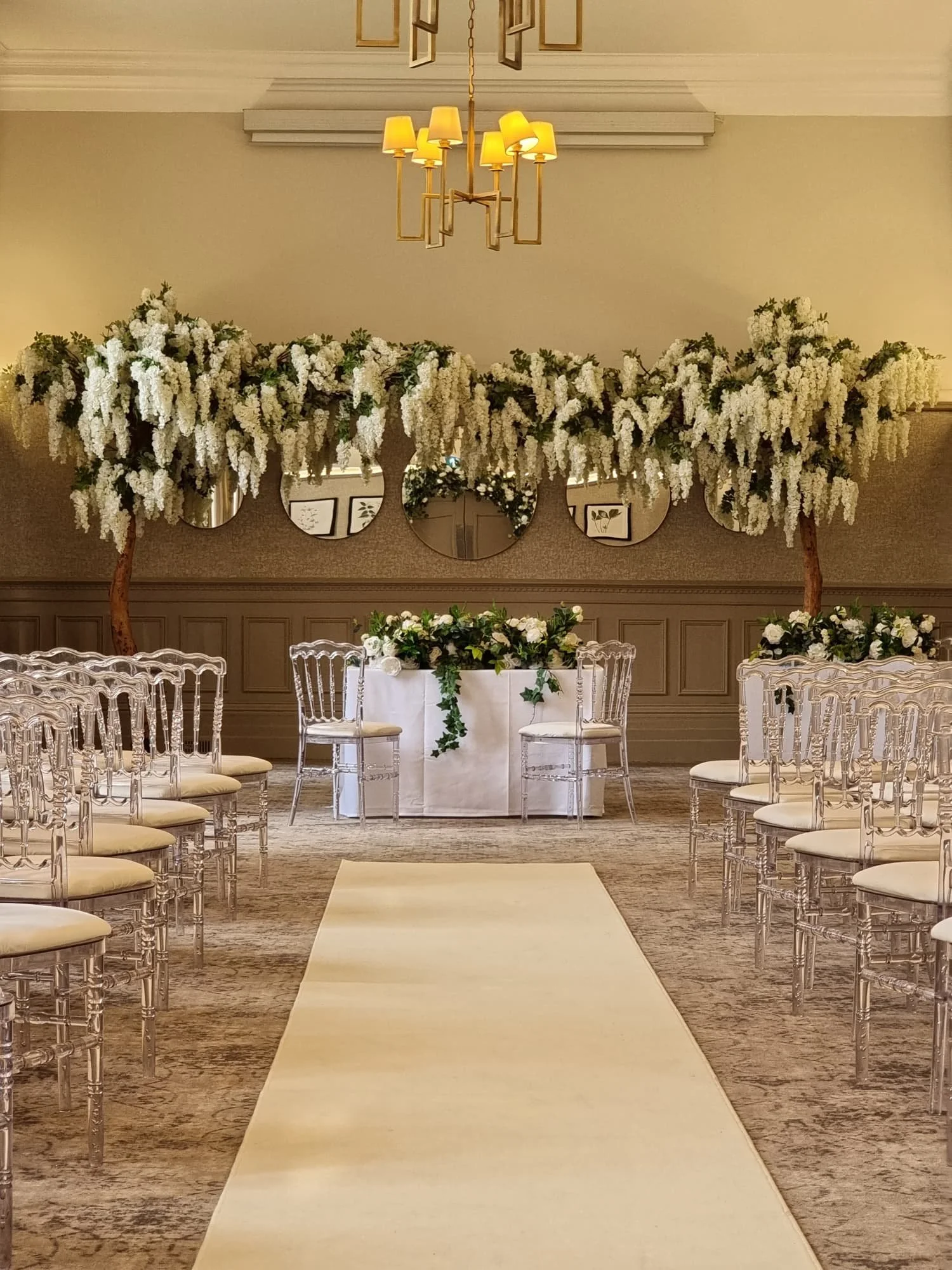 Luxurious artificial canopy trees with cascading white silk wisteria blooms